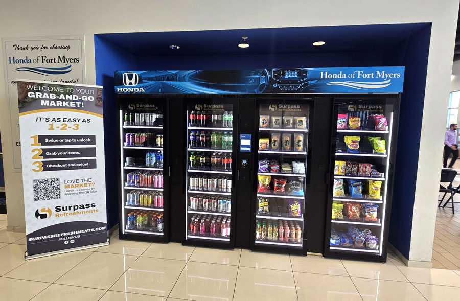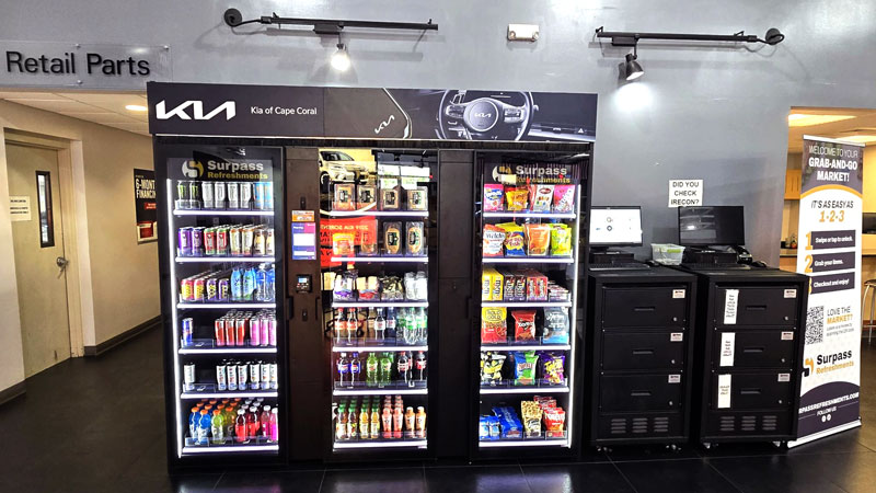 Magnetic header cooler display for Kia of Cape Coral service lounge, great for micro markets, vending machines, and AI coolers