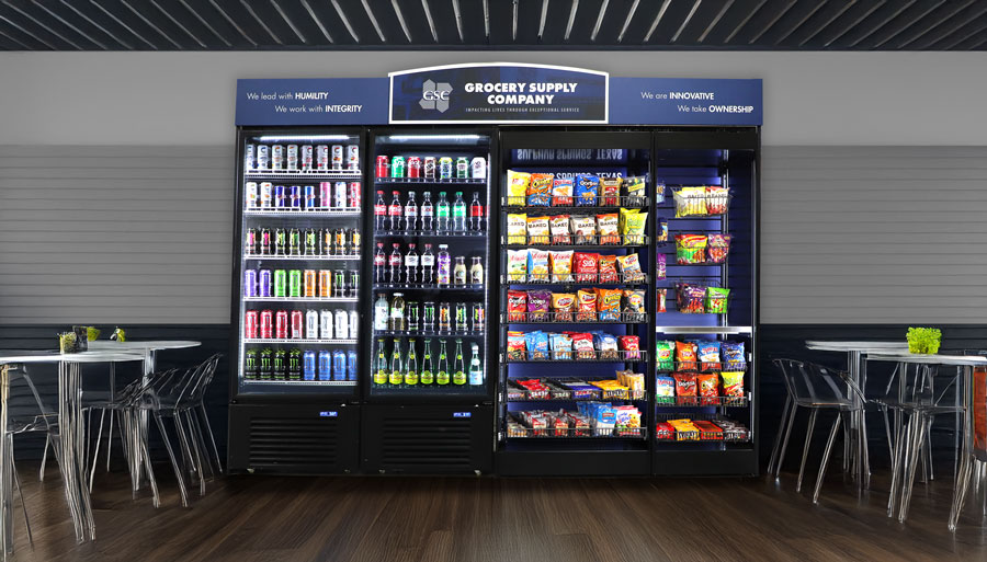 Magnetic header cooler and shelving display in modern office lounge, great for micro markets, vending machines, and AI coolers
