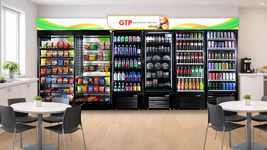 Magnetic header cooler and snack display for Graphics That Pop breakroom, great for micro markets, vending machines, and AI coolers