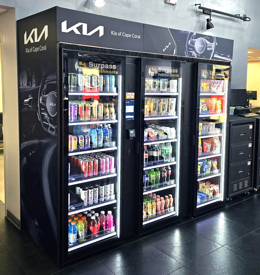 Magnetic header cooler bank for Kia of Cape Coral with full-wrap branding, great for micro markets, vending machines, and AI coolers